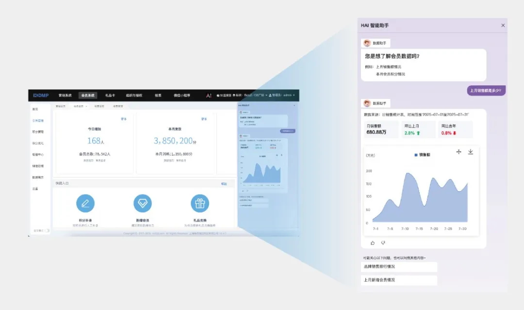 借助AI技術(shù),海鼎科技旗下商管、數(shù)字化營銷平臺(tái)等產(chǎn)品已初步具備智能分析能力。AI助手能夠基于系統(tǒng)內(nèi)部數(shù)據(jù)進(jìn)行分析,揭示數(shù)據(jù)背后的規(guī)律與趨勢(shì),實(shí)現(xiàn)從“發(fā)生了什么”到“為什么會(huì)發(fā)生”再到“未來如何行動(dòng)”的升級(jí)轉(zhuǎn)變。這一轉(zhuǎn)變,不僅提升了系統(tǒng)的應(yīng)用價(jià)值,還為企業(yè)提升了管理準(zhǔn)確性、決策效率,從而幫助商業(yè)體建立行業(yè)競爭優(yōu)勢(shì)。